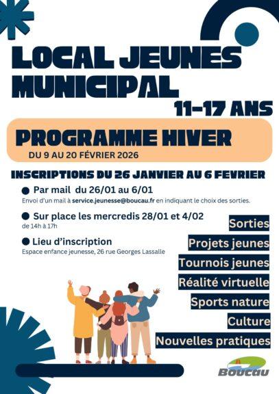Le programme du Local Jeunes Municipal est proposé par le Pôle Enfance Jeunesse de la Ville de Boucau du 9 au 20 février 2026.